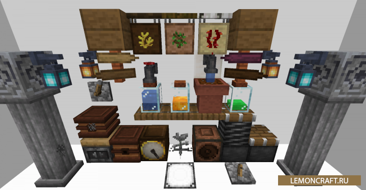 Мод на анимированные декорации Supplementaries добавляет в игру большое количество анимированных декоративных блоков имеющих индивидуальный функционал и отлично вписывающихся в ванильную составляющую игры.